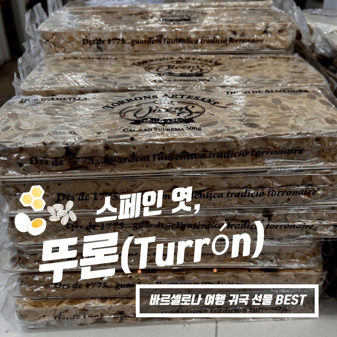 한국인들에게 스페인 엿이라고 알려진 까딸루냐 전통 디저트가 있습니다. 실제로 먹어보면 엿처럼 질겅거리는 것보다 아몬드 가루의 고소함이 퍼석하게 느껴지는 맛입니다. 바르셀로나 관광지 어디에나 가면 볼 수 있는 이것, 오늘은 뚜론(Turrón)에 대해 알려드릴게요.