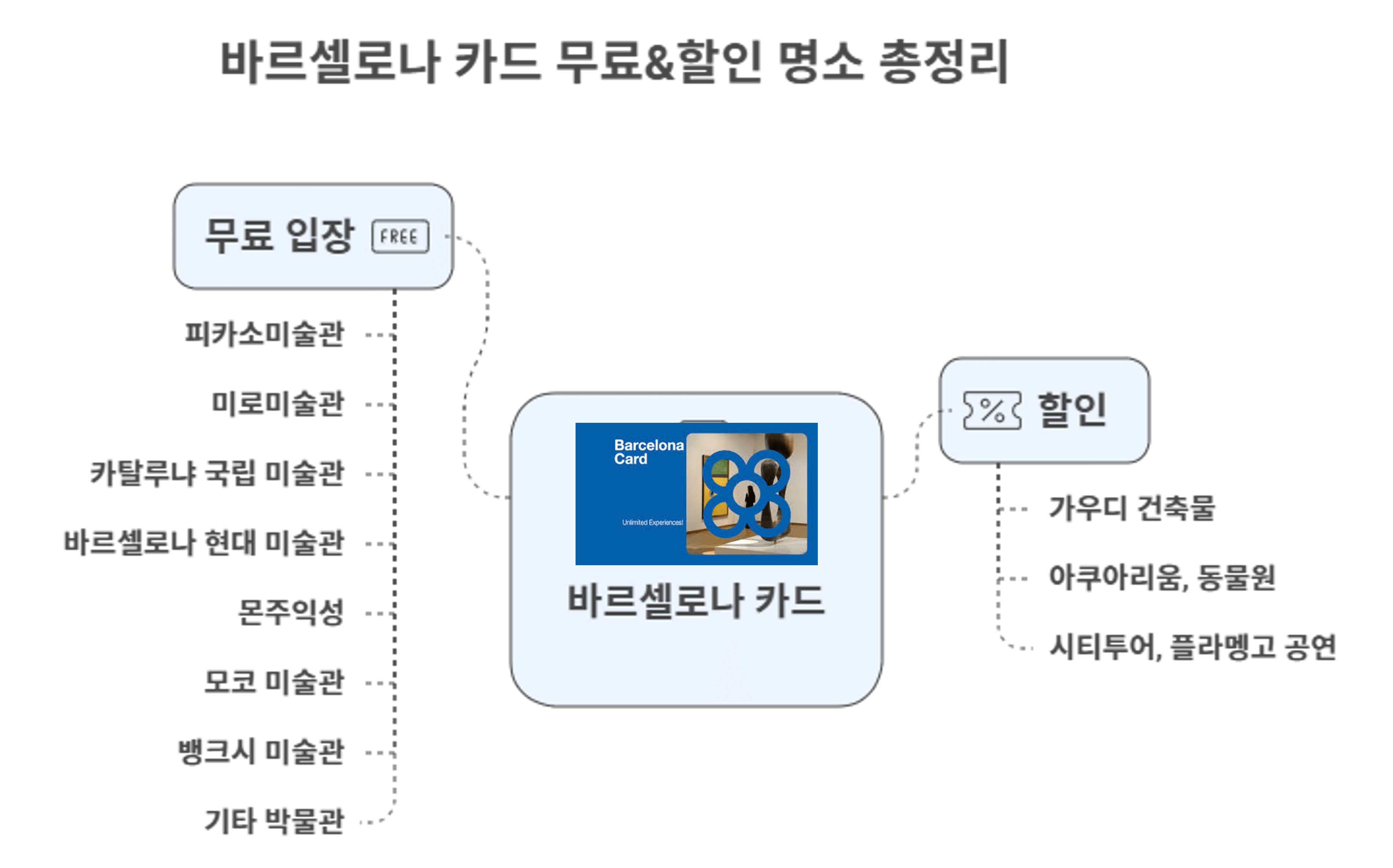 - 그 외: 바르셀로나 이집트 박물관 (Museu Egipci de Barcelona), 초콜릿 박물관 (Museu de la Xocolata), 디자인 박물관 (Museu del Disseny) 등 다양한 테마의 박물관들도 바르셀로나카드로 무료 입장이 가능합니다.