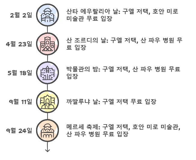 바르셀로나에서는 특정 축제나 기념일에 박물관들이 무료 개방됩니다. 여행 날짜를 잘 맞춘다면, 추가 비용 없이 다양한 문화 경험을 할 수 있습니다.날짜기념일무료입장 가능한 장소