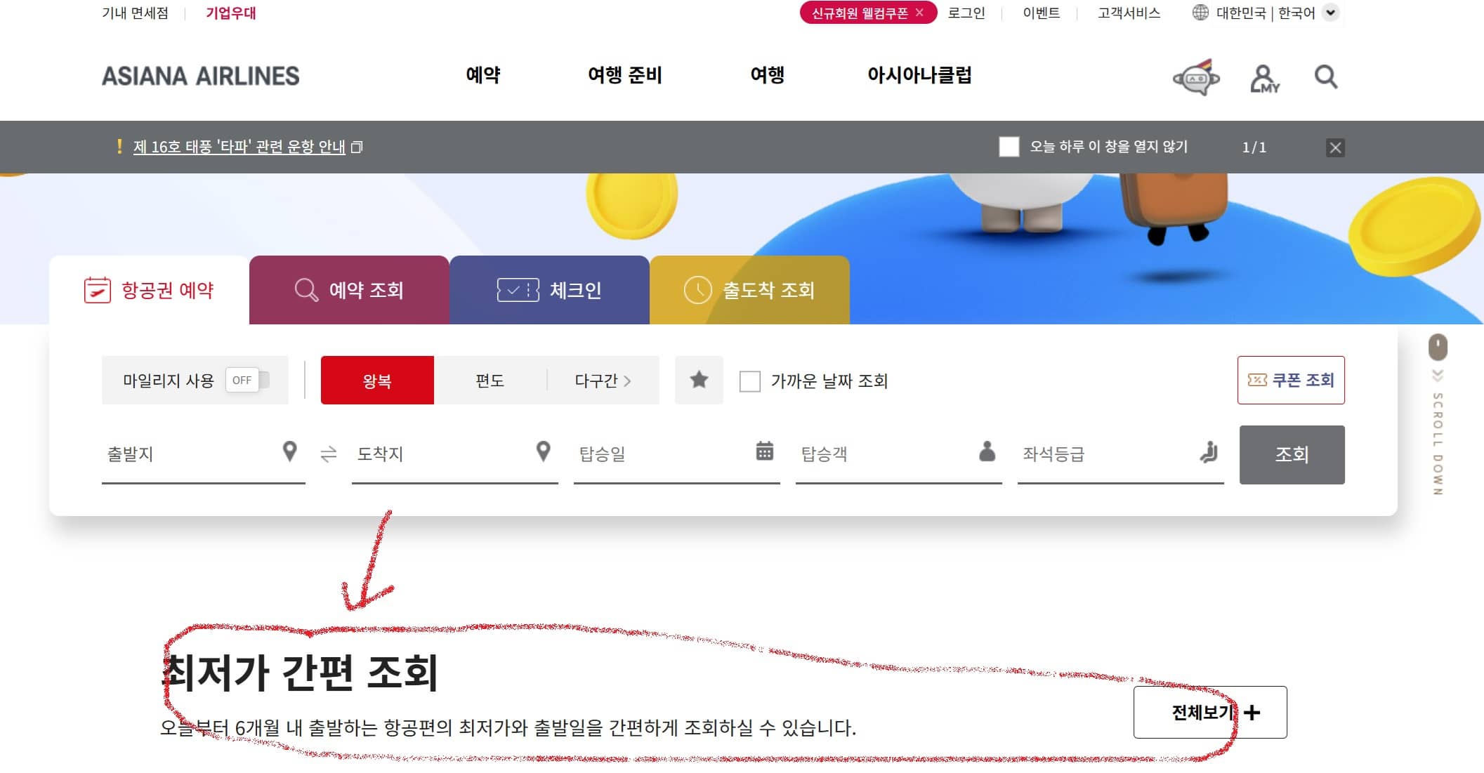 아시아나항공의 경우 일반적으로 티웨이항공보다는 가격대가 높지만, 마일리지 적립이나 서비스 면에서 강점이 있습니다. 아시아나 항공권을 저렴하게 구매하고 싶다면, 홈페이지 하단에 있는 '최저가 간편조회'를 클릭해보세요. 이곳에 목적지와 체류 일자를 입력하면 6개월 동안의 최저가를 한눈에 확인할 수 있어, 아시아나항공에서 제공하는 가장 저렴한 항공편을 찾는 데 큰 도움이 됩니다. 아래 그림을 참고하세요. 하지만 직항 편은 보통 성수기에 가격이 급등하기 때문에, 가격이 최우선인 여행자라면 경유 노선도 함께 고려하는 것이 현명합니다.