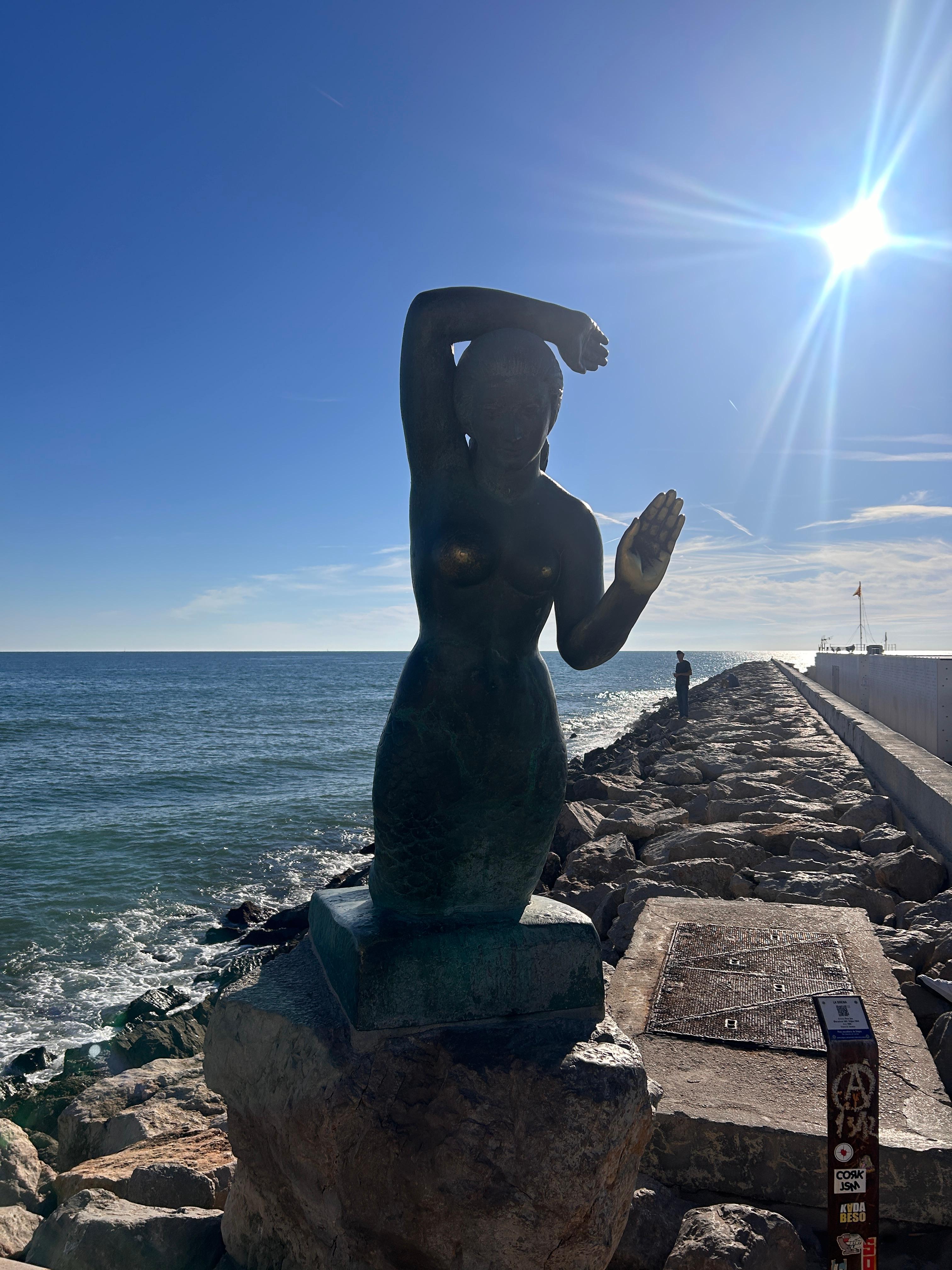 시체스 중심 해변을 따라 걷다 보면, 산 바르톨로메 이 산타 테클라 성당(Església de Sant Bartomeu i Santa Tecla) 앞쪽 절벽 위에 자리한 인어 조각상 La Sirena 를 만나게 돼요.