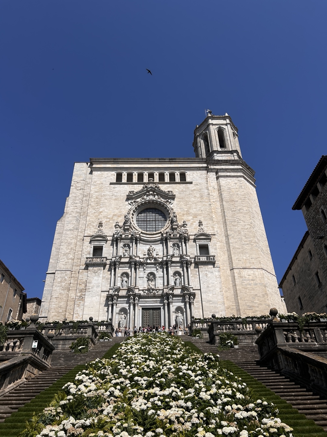 드디어 지로나 여행의 하이라이트 중 하나인 지로나 대성당(Catedral de Girona)입니다! 이곳은 전 세계적으로 유명한 드라마 '왕좌의 게임(Game of Thrones)' 촬영지로도 잘 알려져 있어, 많은 팬들이 찾는 명소입니다. 11세기부터 건설이 시작되어 1788년에야 비로소 완공된 이 성당은 그 압도적인 규모와 아름다움으로 방문객들을 경외하게 만듭니다. 성당 앞 90개의 웅장한 계단은 지로나 꽃 축제(Temps de Flors) 기간에는 다채로운 꽃 장식으로 화려하게 변모하며, 도시 전체를 아름다운 예술 작품으로 탈바꿈시킵니다. 이곳에서 드라마 속 한 장면을 떠올리며 중세의 웅장함을 느껴보세요!